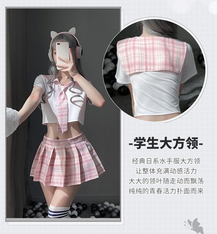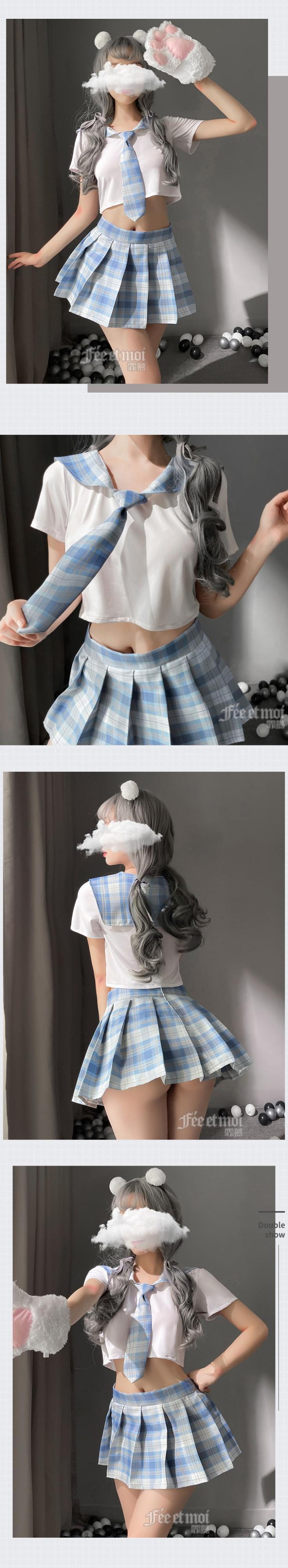 色:ホワイト+ブルーグリッド【ブラウス+ネクタイ+プリーツスカート+T,ホワイト+ピンクグリッド【ショートジャケット+ネクタイ+プリーツスカート+T,ホワイト+パープルチェック[ショートトップ+ネクタイ+プリーツスカート+T,トップス+ネクタイ+プリーツスカート+Tパンツ]+学生靴下