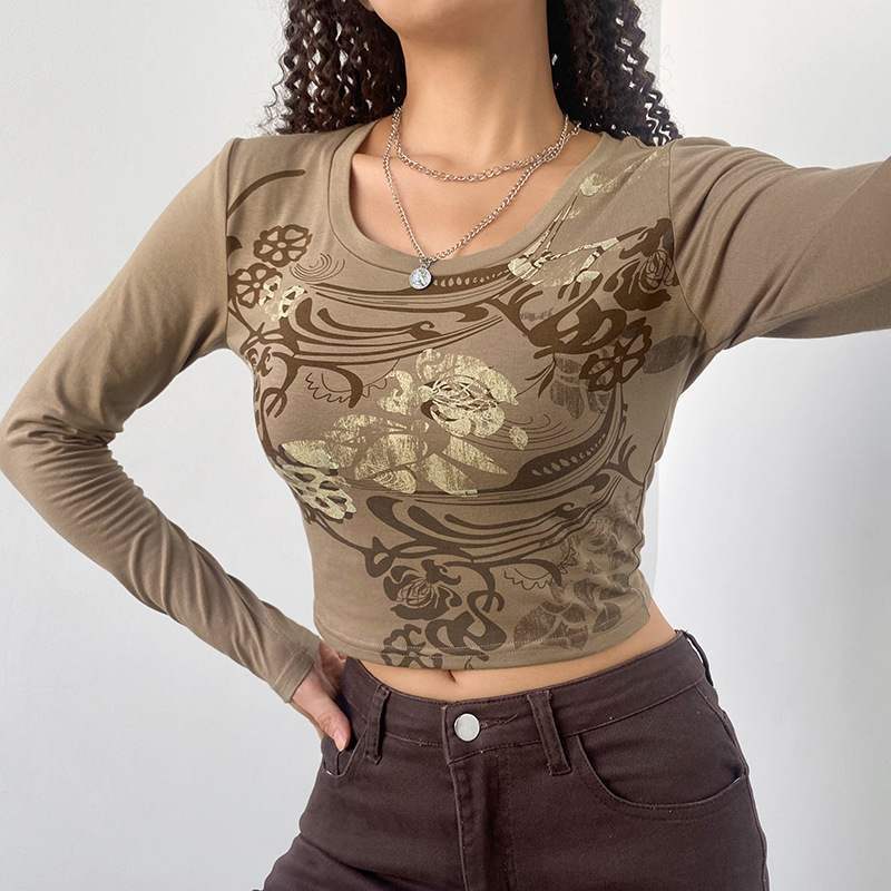 カーキスタンダードプリントTシャツ パターンショート長袖スリーブトップス ロング レトロ ヨーロピアン 9/24 ナイトウェア mi1160590859484