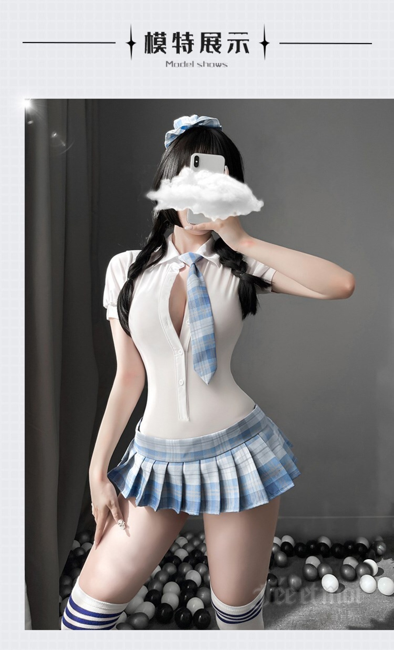 色:白+青グリッド[小さな帽子+ネクタイ+ジャンプスーツ+百,+ジャンプスーツ+プリーツスカート]+白いストッキング