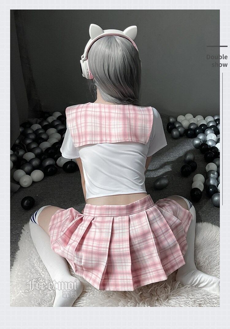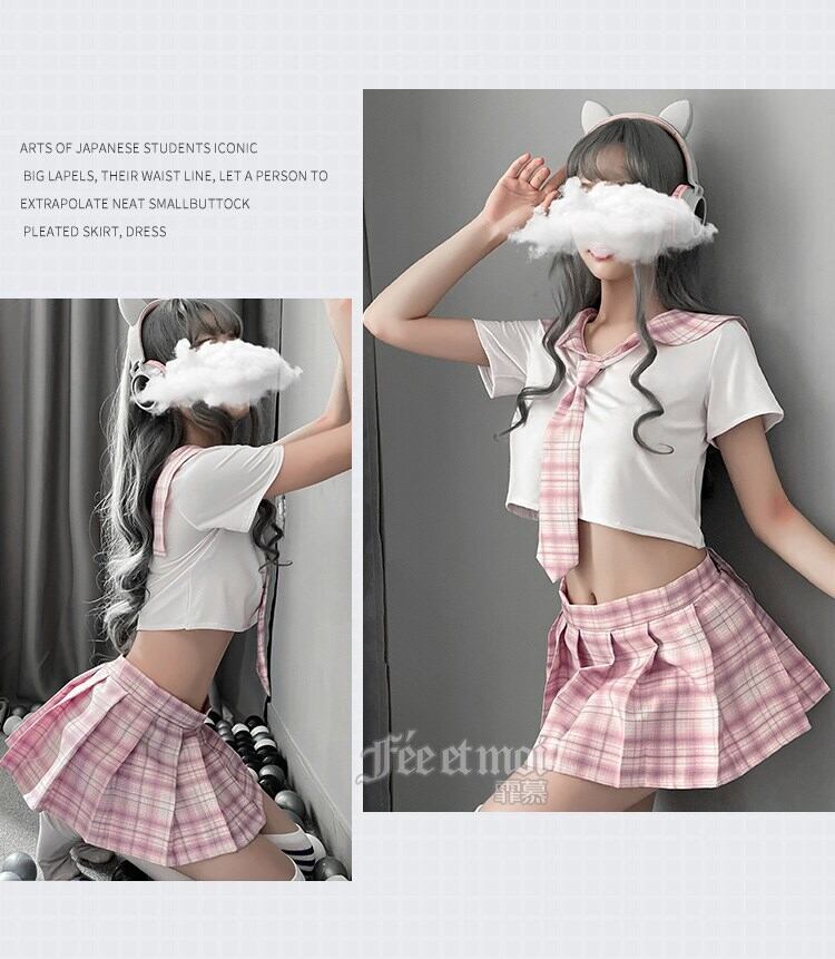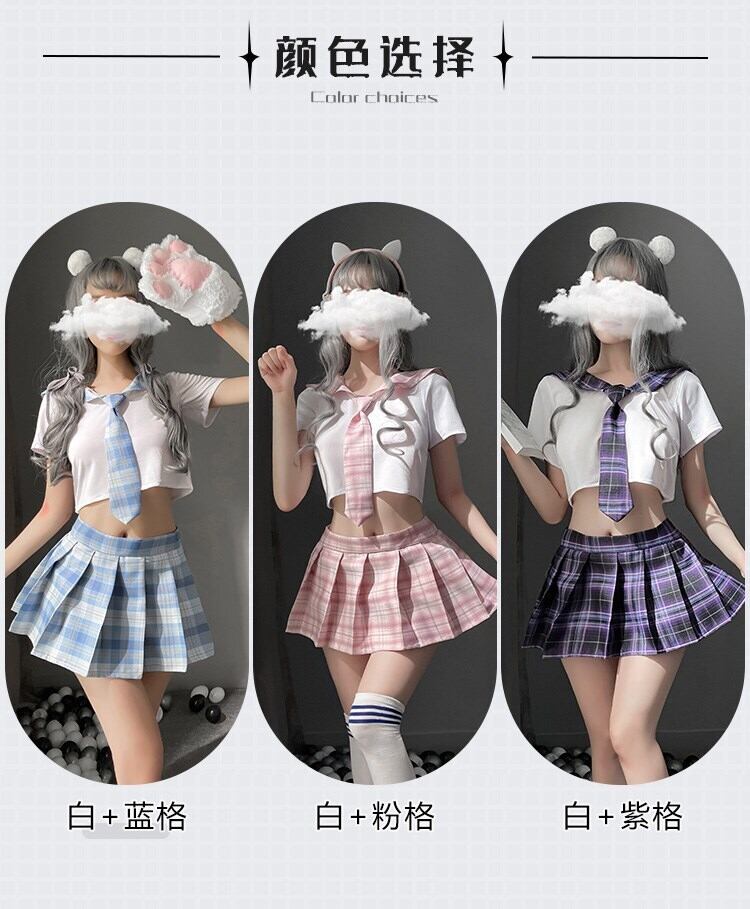 色:ホワイト+ブルーグリッド【ブラウス+ネクタイ+プリーツスカート+T,ホワイト+ピンクグリッド【ショートジャケット+ネクタイ+プリーツスカート+T,ホワイト+パープルチェック[ショートトップ+ネクタイ+プリーツスカート+T,トップス+ネクタイ+プリーツスカート+Tパンツ]+学生靴下