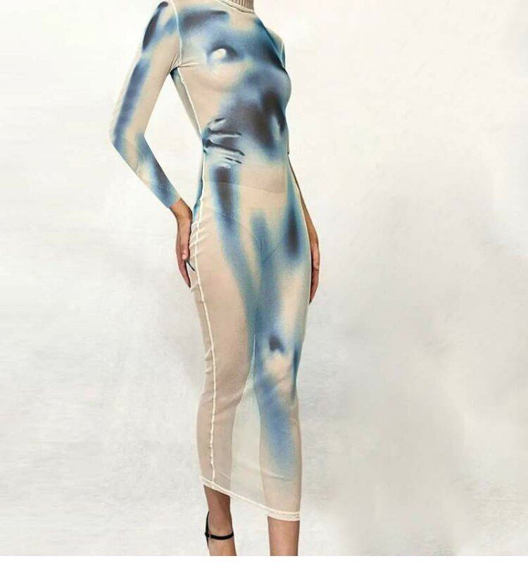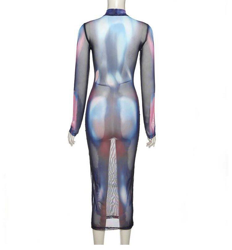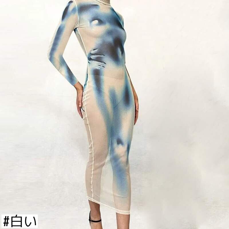 スリムオータムウィンターメッシュプリントドレス ロング 秋物 冬物 9/24 ナイトウェア mi1143223717422