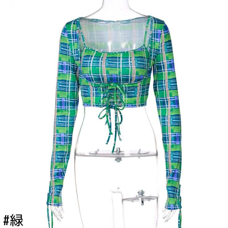 プリントオータム格子柄スリムフィットカラーTシャツ ロング 秋物 スクウェア ヨーロピアン 9/24 ナイトウェア mi1116833127367