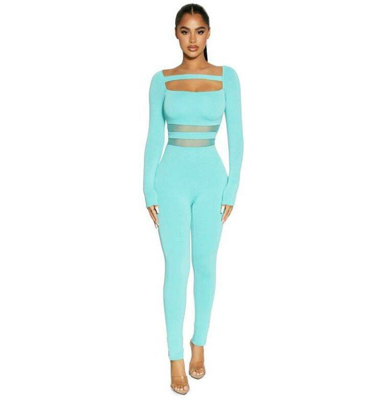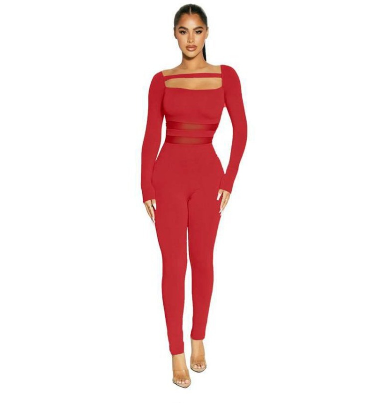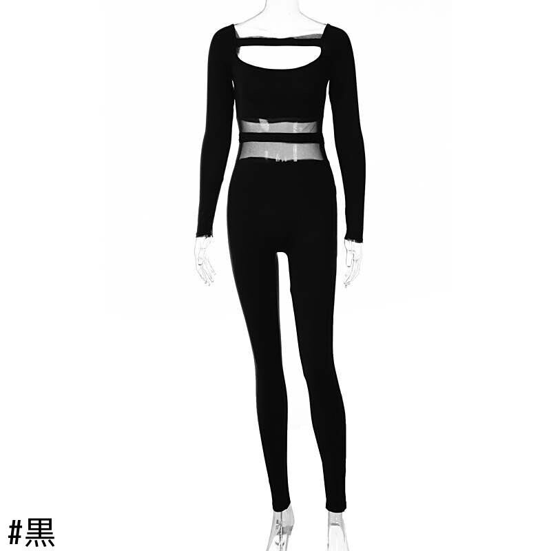 ソリッド カラーメッシュジャンプスーツ オールインワン ソリッドカラー スクウェア ヨーロピアン ステッチ 9/24 ナイトウェア mi1155623323038