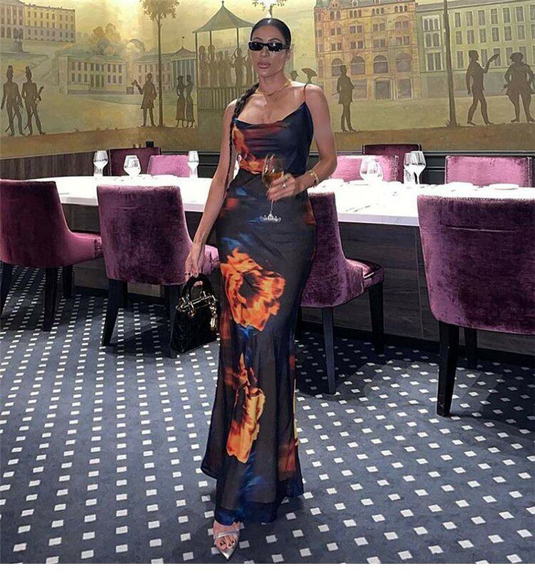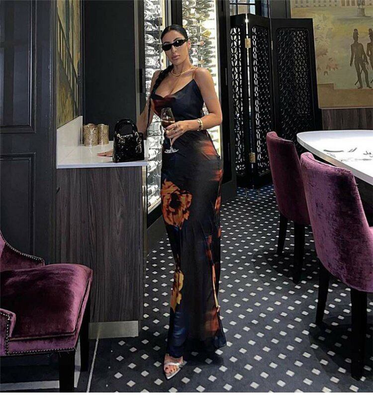 スタイルオータムウィンターVネックプリント柄バックレススリムドレス 秋物 冬物 ヨーロピアン 9/24 ナイトウェア mi117332312340
