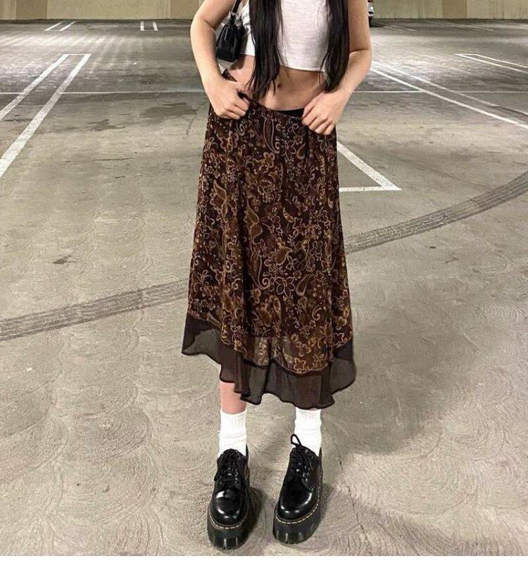 スタイルスカート スタンダードブラウンプリントカジュアルハイウェストウェストメッシュ レトロ ヨーロピアン 9/24 ナイトウェア mi1192766429371